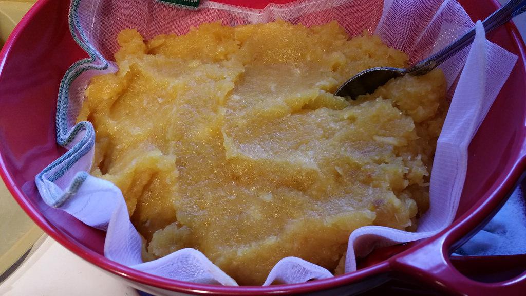 - Line a colander with cheesecloth or mesh, and fill it with the cushaw. Let it sit over a mixing bowl or the sink, until it stops dripping.