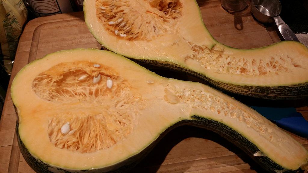 - Use a large spoon to scrape the seeds and stringy "squash guts" out of the center cavity. The cavity might extend into the slim neck, or the neck might be solid "meat".