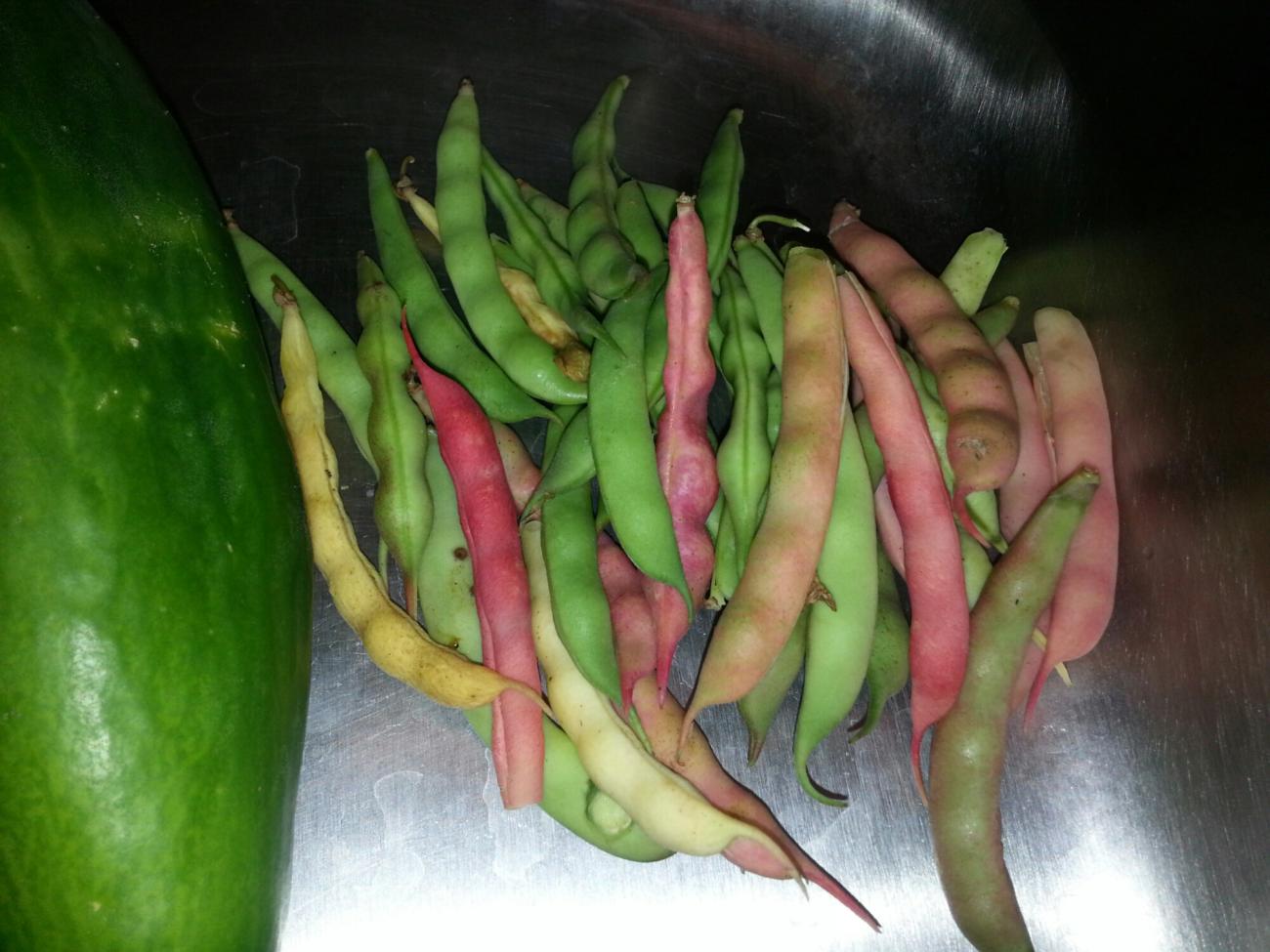 Pictured here, next to a large cucumber, are a couple of handfuls of green (and pinkish-red!) green beans. I've had about four large handfuls so far, or about 3 large servings. In case you are wondering a "mess" of something is an old colloquial term (at least in Appalachia) for a pile or batch of something. This is from a small number of plants in a very short row, growing on a clay hillside. These beans are an heirloom type from East Tennessee called "Peanut Beans". I'm assuming this is because the largish beans in the pods often have the same pink color as small peanuts. Alas, just like the French purple beans, these will turn green once they are cooked. They appear to be a half-runner type, and may also sometimes be called "Appalachian Pink Half-Runner". I"m excited to get to eat my first serving of these, from my own garden! There aren't very many mentions of these beans online, but I did manage to find a few. The ones who are trying to sell something, I have no association with. I bought my seeds at a local feed store in Jefferson City, TN.