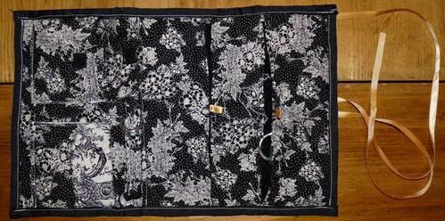 I thought I was being clever and making it easier by using velcro instead of zippers; wrong! The velcro was very hard to sew through with the thick quilted fabric I chose to use. I recommend you use zippers instead! The edging is grosgrain ribbon, with a gold satiny ribbon for pull tabs and the tie.